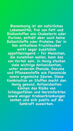Wichtig zu wissen über reinen Natur-Honig: Echter Honig kann aufgrund von Temperaturunterschieden wie extremer Kälte kristallisieren (er härtet mit einer weißen Schicht). Dies ist bei reinem Honig ein normales Phänomen. Die weiße Schicht sind bei unseren Honigsorten Ablagerungen von natürlichen Bienenwaben. Sehr starke Sorten bilden auch oft am Deckel und mitten drin kleine schwarze Klumpen, das ist natürlicher Propolis, ein Produkt das 15x teurer ist als der Honig selbst. Beides bringt noch mehr Qualität.